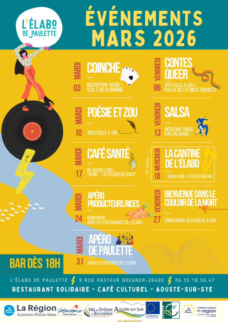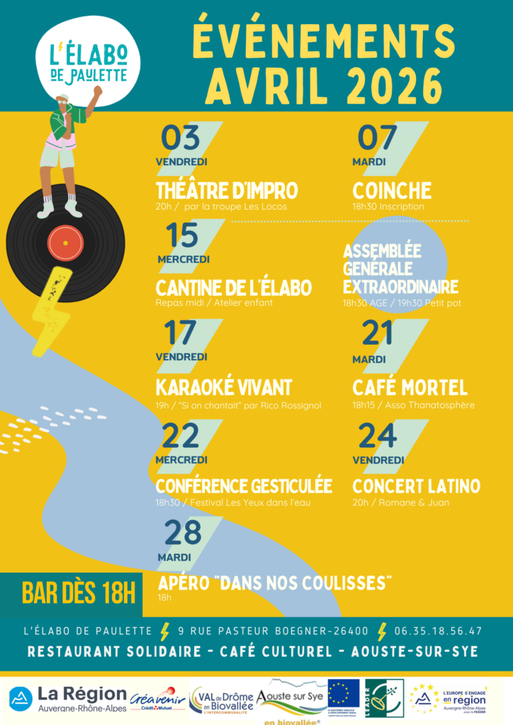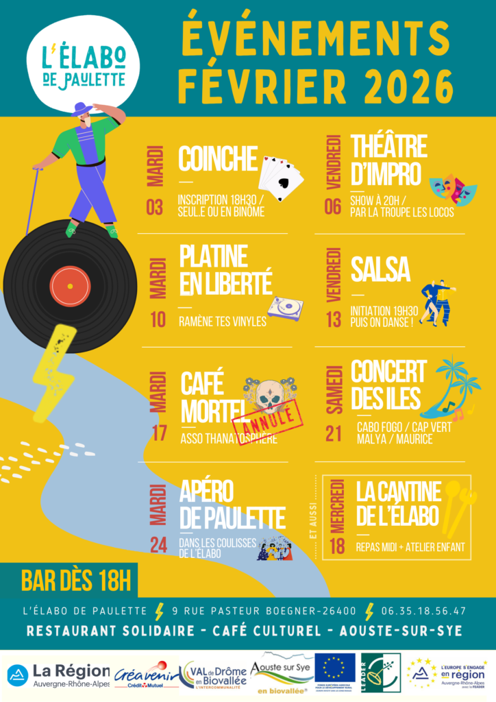 Chaque semaine, nous organisons des soirées culturelles variées : concerts, projections, spectacles, salsa, karaoké, coinche et plus encore ! Les entrées sont gratuites ou à prix libre, et une petite restauration à prix réduit est parfois disponible.