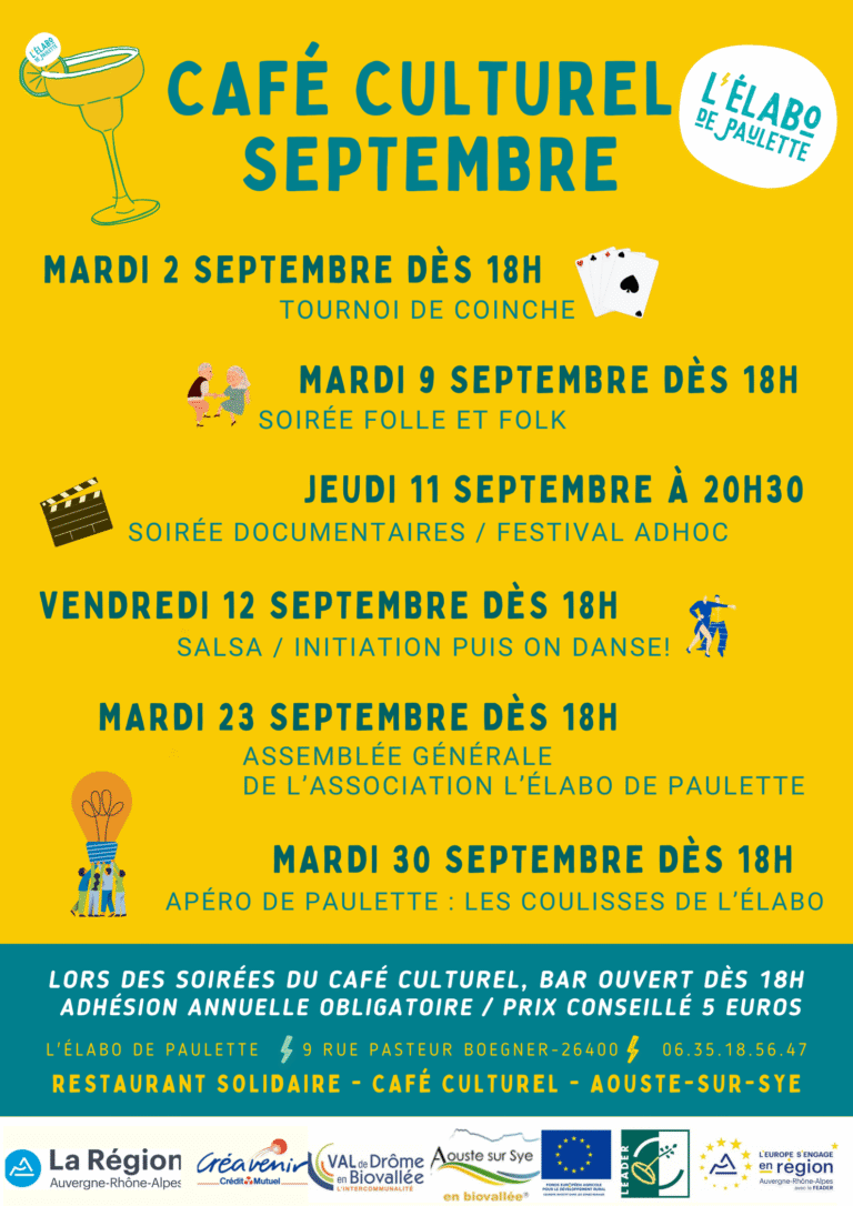 Nous organisons chaque semaine plusieurs soirées culturelles pour offrir à tous une programmation riche et variée : concerts, projections de films, spectacles d’improvisation, soirées salsa et folk, karaoké, coinche, café mortel, café santé, expositions… De quoi satisfaire toutes les envies !